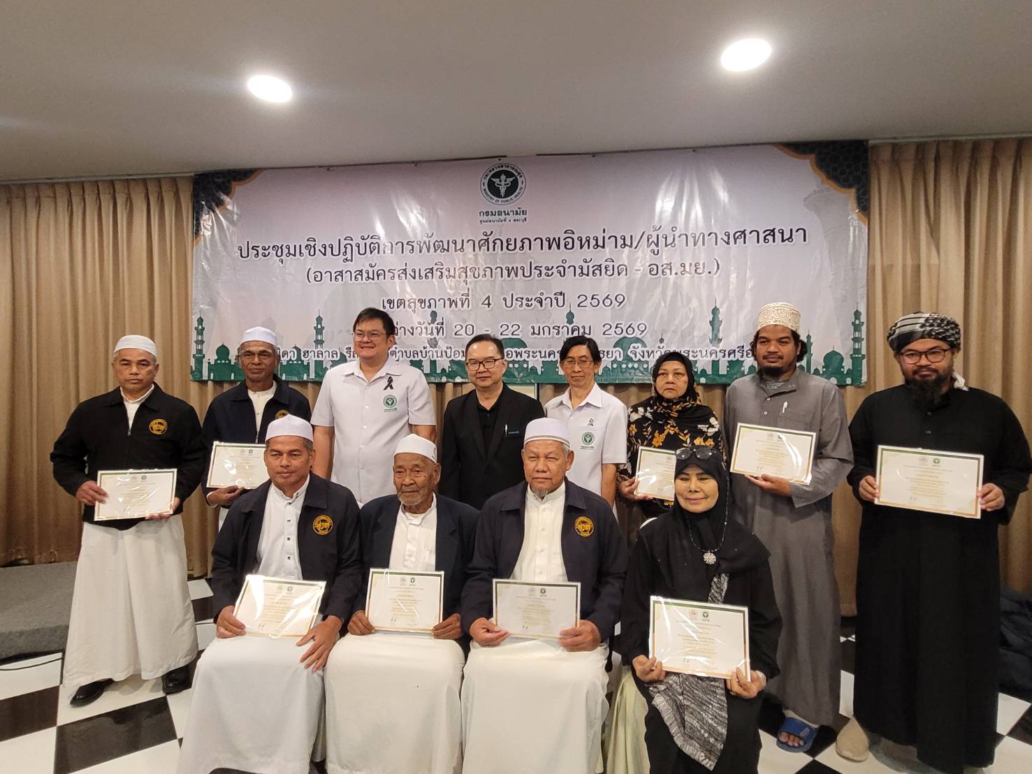 เมื่อวันที่ 22 มกราคม 2569 ทันตแพทย์ณัฐพงค์ กันทะวงค์ ผู้อำนวยการสำนักอนามัยผู้สูงอายุพร้อมด้วยผู้รับผิดชอบงานกลุ่มส่งเสริมสุขภาพผู้นำทางศาสนาและศาสนสถาน ได้เข้าร่วมงานประชุมเชิงปฏิบัติการพัฒนาศักยภาพอิหม่าม/ผู้นำทางศาสนา (อาสาสมัครส่งเสริมสุขภาพประจำมัสยิด -อส.มย.) เขตสุขภาพที่ 4 ประจำปี 2569 ที่จัดขึ้นระหว่างวันที่ 20 - 22 มกราคม 2569 ณ วนิดา ฮาลาล รีสอร์ท จังหวัดอยุธยา วัตถุประสงค์ 1) เพื่อขับเคลื่อนการดำเนินงานสร้างความรอบรู้ด้านสุขภาพผู้นำชุมชนมุสลิม ให้อิหม่าม/ผู้นำทางศาสนามีความรู้ ความเข้าใจในการดูแลส่งเสริมสุขภาพอนามัย และเป็นต้นแบบด้านสุขภาวะที่สอดคล้องกับวิถีชุมชน 2) เพื่อเป็นต้นแบบของการขับเคลื่อนในมิติงานด้านสาธารณสุขที่สอดคล้องกับวิถีชุมชน ซึ่งจะนำไปสู่คุณภาพชีวิตที่ยั่งยืนตามบริบทพื้นที่ และนำสู่การขยายผลครอบคลุมพื้นที่ในเขตสุขภาพที่ 4 และ 3) มุ่งยกระดับมัสยิดให้เป็นศูนย์กลางสร้างเสริมสุขภาวะชุมชน กลุ่มเป้าหมาย ประกอบด้วยอิหม่าม/ผู้นำทางศาสนา เจ้าหน้าที่สาธารณสุข และภาคีเครือข่าย จำนวน 61 คน